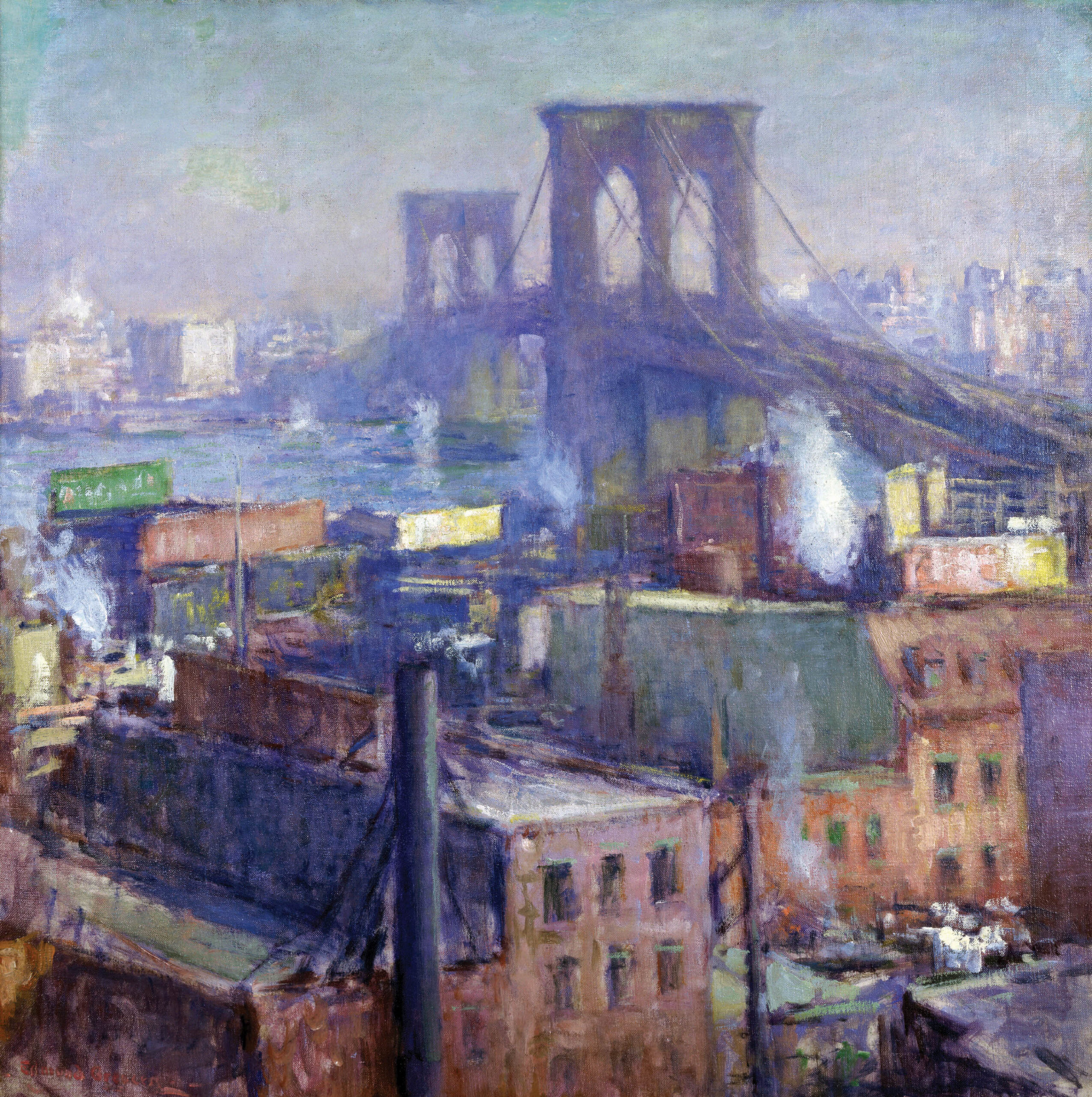 Edmund William Greacen (American, 1877 – 1949), Brooklyn Bridge, East River, 1916, oil on canvas, 37 x 37 ½ in., Gift of Mr. and Mrs. René Faure, daughter of Edmond Greacen, AG.1972.2.1